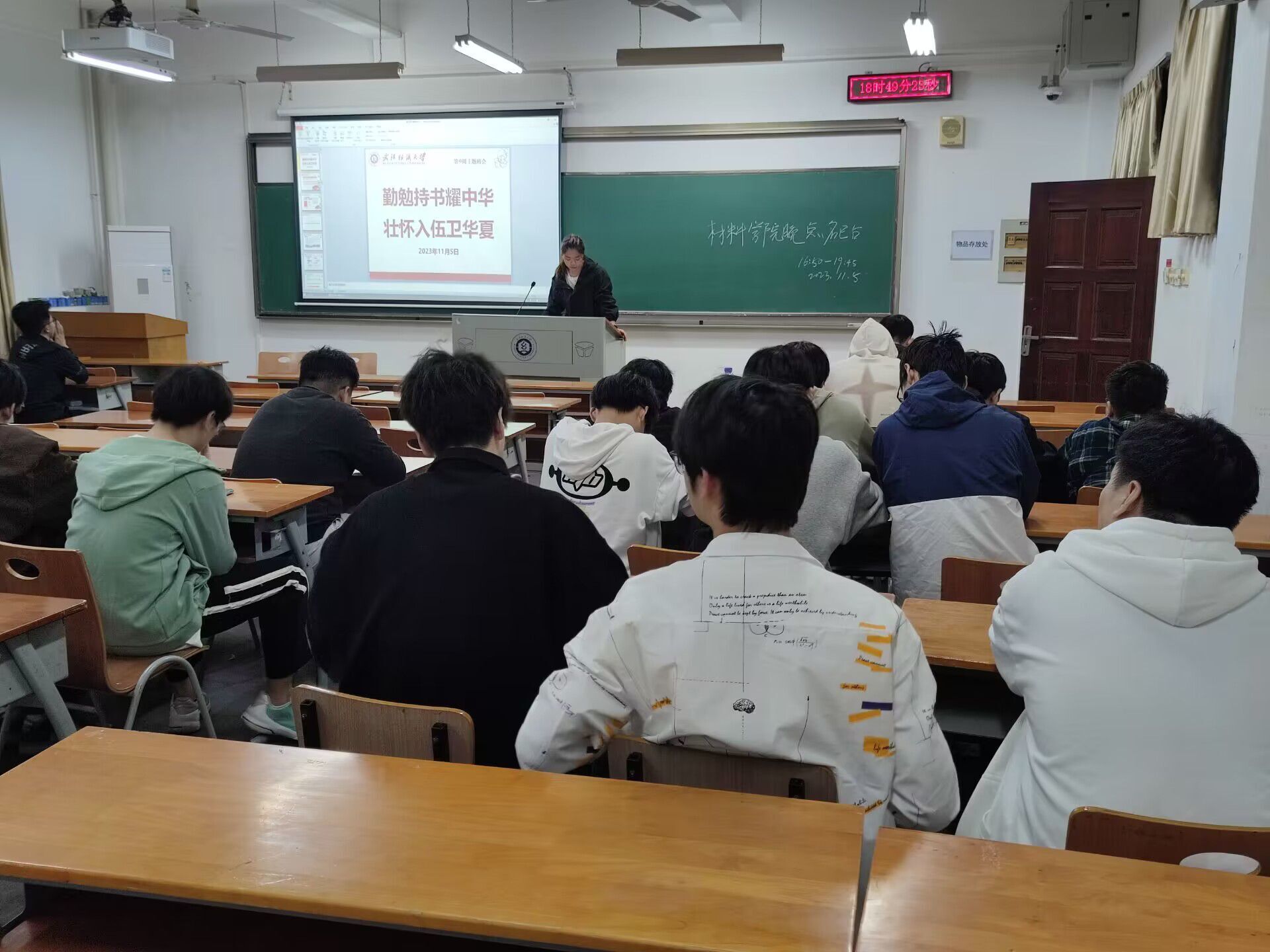 会议伊始,全体辅导员、班主任对所带的年级进行点名,核查学生报到情况,落实并上报未报到学生的名单及事由,班主任和辅导员对未到的学生进行逐一联系。班主任、辅导员结合学工部下发的晚点名要求,召开“勤勉持书耀中华 壮怀入伍卫华夏”主题班会。首先,以习近平总书记寄语“坚定理想信念站稳人民立场,练就过硬本领投身强国伟业”开篇,介绍征兵入伍政策、军营生活,引导广大适龄青年朋友积极投身军营,书写无悔人生。其次,引导广大学生感恩资助、立志成才,提醒合理使用资助金,树立正确消费观,要心怀感恩、立志回报社会,要勤俭节约、营造良好风气,要合理计划、减轻家庭负担,要榜样引领、营造良好学风。