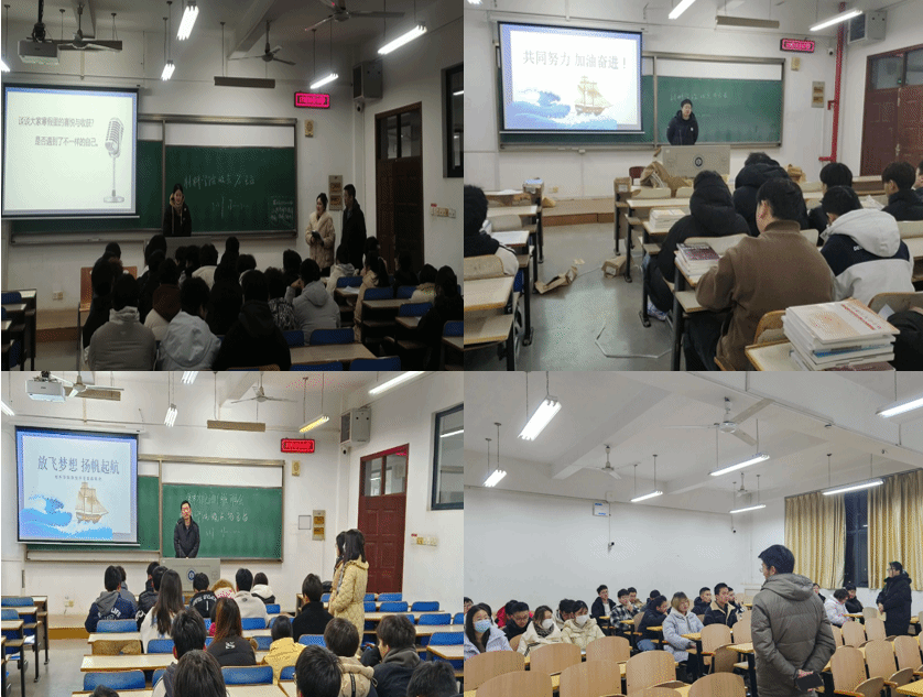各年级辅导员及各班班主任会前充分准备,结合学生实际,从开学篇“应对长假综合症”“调整生物钟”“做好上课准备”;畅谈篇“谈谈寒假里的喜悦与收获”;安全篇“防火刻不容缓、保障宿舍安全”“安全使用电动车”“防诈从我做起”;学习篇“合理规划学习时间”“养成良好学习习惯”等方面给大家提出建议,提醒大家在新学期要平衡好学习和娱乐休闲的关系。