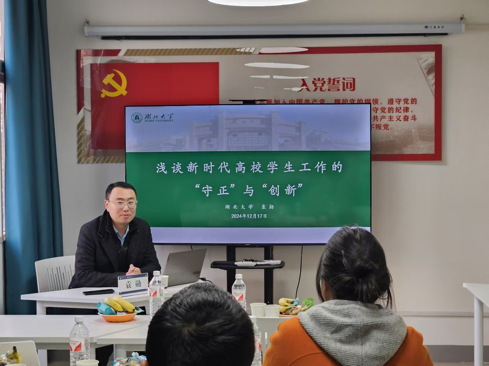 袁勋以《浅谈新时代高校学生工作的“守正”与“创新”》为题作报告。他聚焦新时代高校学生工作的新情况和新挑战,强调学生工作既要守住思想政治教育这一“正道”,又要寻求新的突破和发展;辅导员既要牢牢把握九大工作职责扎实开展各项工作,又要结合自身学科背景和学校特色创新驱动发展。他结合黑神话悟空爆火谈如何将思想政治工作做活、做细、做实,强调我们要善于捕捉热点、难点、焦点,坚持内容为王,创新工作方法,在不断的实践探索中让“新法子”变成“老牌子”,让学生工作焕发生机活力。