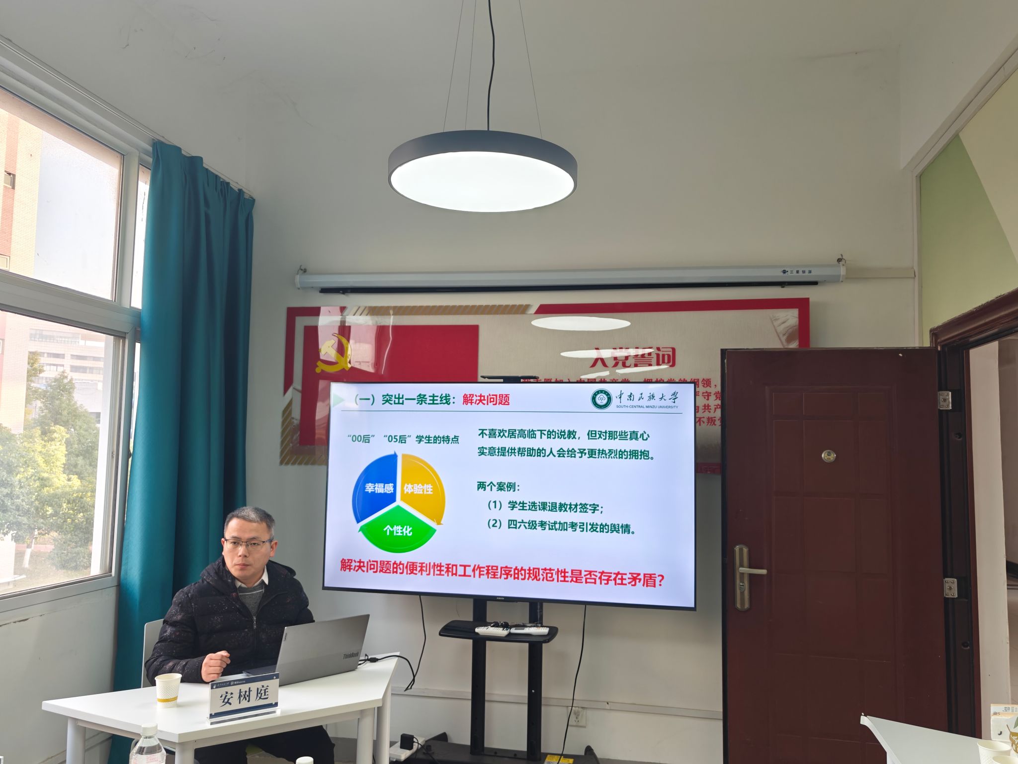 安树庭以《关于提高辅导员政治素养和工作能力的几点思考》为题作报告。他从《普通高等学校辅导员队伍建设规定》切入,强调了辅导员提高政治素养的必要性和重要性,并分别从辅导员的政治能力是什么、怎么练、怎么用三个方面进行详细讲解。他强调我们要用矛盾的观念认识辅导员岗位职责,处理好好“职业与事业”“投入与产出”“资源与牵挂”这三对矛盾,不断提升自身核心素养;要用斗争的思维培养职业素养,聚焦解决问题主线,守住“两个底线”、掌握“三种语言”,做好“四个结合”,用榜样的力量提高工作成效,提升个人硬实力。此外,安树庭还结合辅导员素质能力大赛真题、辅导员工作室建设、辅导员职业生涯规划等内容进行分享。
