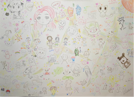 笔尖流转间,个性与温暖交织:有人以柔和线条绘出“与朋友并肩的自己”,传递陪伴的力量;有人用明亮色块勾勒星空与海洋,寄托对自由的向往;也有人以抽象几何图案表达情绪,展现内心的独特世界。每一幅局部创作都风格迥异,却在巨幅画纸上和谐相融——正如多彩的世界,每个个体都是独一无二的存在,少了任何一笔,整体的完整性便会有缺憾。即便画纸空间有限,参与的师生总能找到合适的位置落下笔触,在集体创作中自然融入“大家庭”,诠释着包容与共生的内涵。