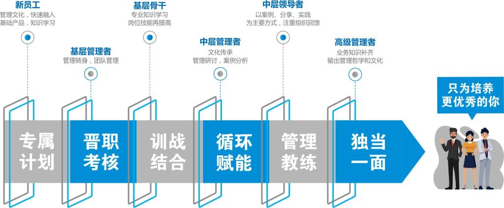 公司坚持“人皆有才,人尽其才”的人才理念,致力于打造多元化、全方位、高成才的人才培养体系,包括新员工系列、个人成长系列、专业提升系列、管理提升系列、晋升发展系列等,内部培训与外派学习相结合,全面助力大学生人才跑赢职场。