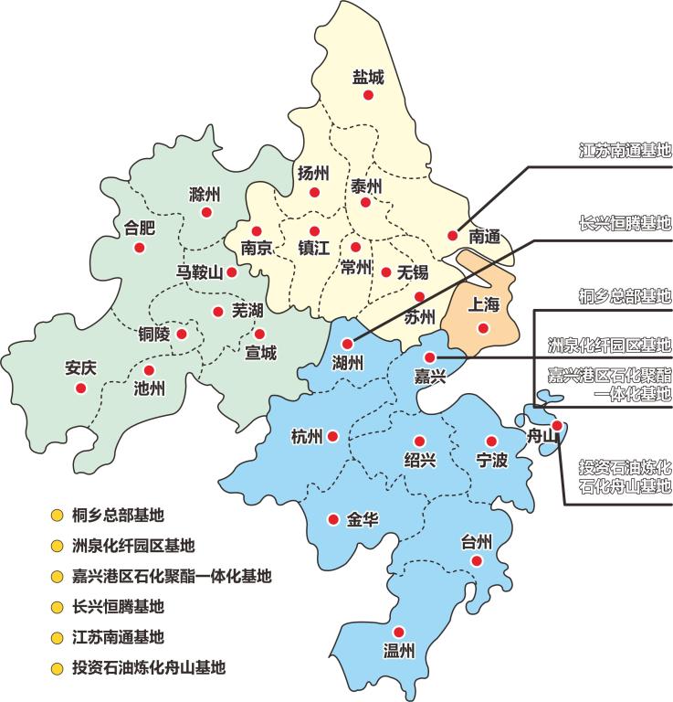桐乡总部基地、洲泉化纤园区基地、嘉兴港区石化聚酯一体化基地、长兴恒腾基地、江苏南通基地、投资石油炼化舟山基地。