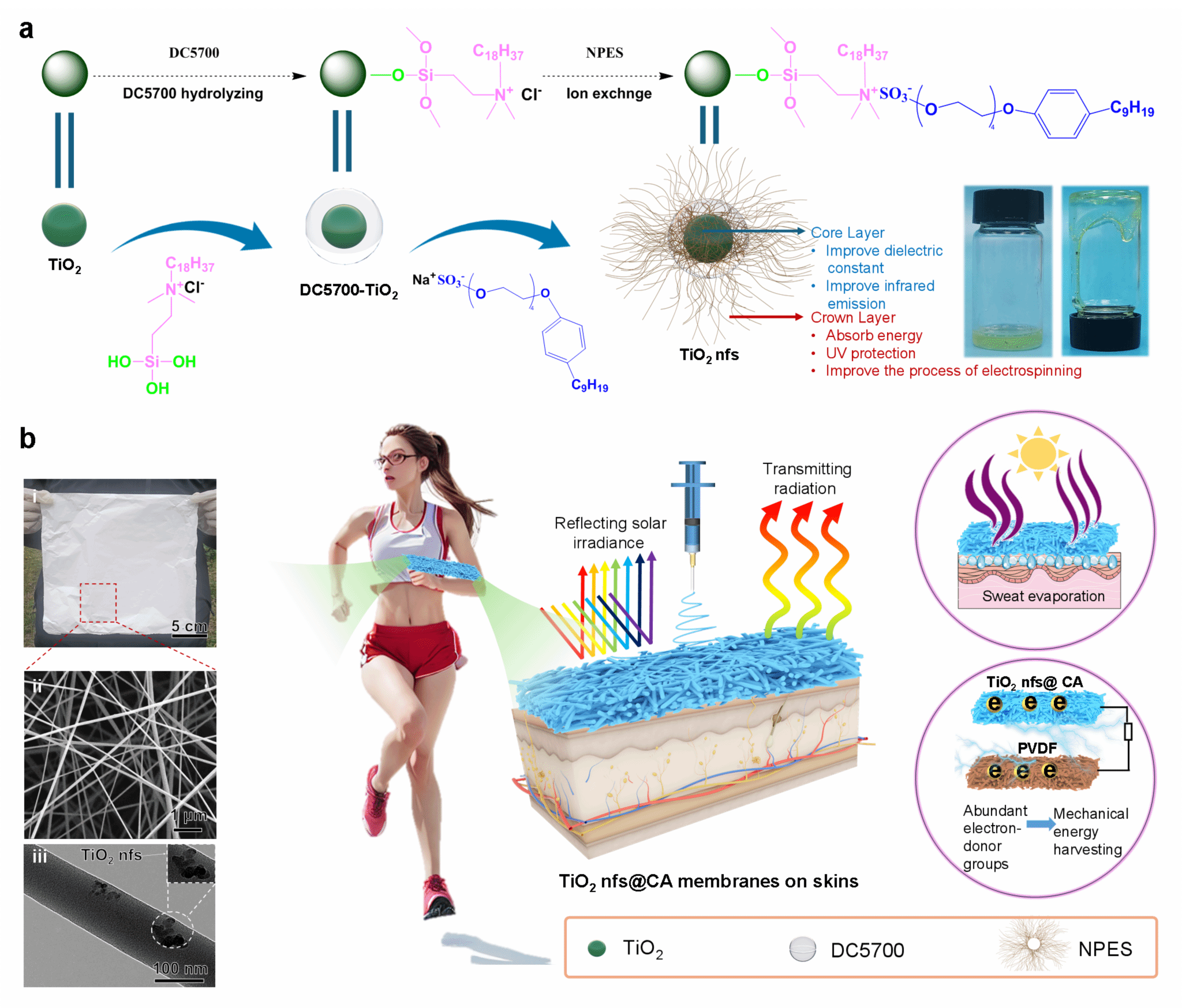 近日,武汉纺织大学葡京娱乐场 殷先泽教授团队,与葡京娱乐场 杨诗文副教授及佛山市第二人民医院文先杰教授合作,在《Nano Energy》上发表了题为“Phase transformation enabled textile triboelectric nanogenerators for wearable energy harvesting and personal thermoregulation”的论文。武汉纺织大学葡京娱乐场 和先进纺纱织造及清洁生产国家地方联合工程实验室为第一单位。葡京娱乐场 研究生陈之诚、徐梅为共同第一作者。该论文详细分析了二氧化钛无溶剂纳米类流体(TiO2 nfs)在织物型摩擦电纳米发电机(t-TENGs)的应用,报道了二氧化钛无溶剂纳米类流体在人体温范围内迷人的相变吸热特性及其在机电转化中面向生命健康传感的应用(图1)。
